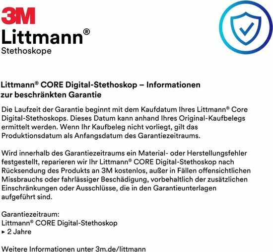 De 3M Littmann CORE digitale stethoscoop is een 3M Littmann Cardiologie IV stethoscoop met een voorgemonteerd CORE digitaal hulpstuk. Raadpleeg de respectievelijke gebruikershandleidingen voor instructies voor gebruik.