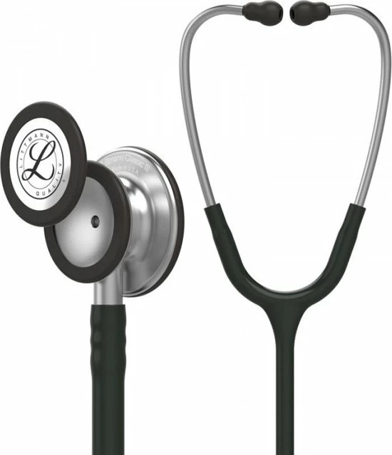 Het dubbelzijdig borststuk is veelzijdig omdat het beschikt over instelbare membranen aan de grote en aan de kleine zijde. De Classic III is dus te gebruiken voor zowel volwassen als kleine(re) pati?nten.Door de hoge akoestische gevoeligheid is de 3M? Littmann? Classic III? Stethoscoop een uitstekend instrument voor het verrichten van hoogwaardig lichamelijk onderzoek. De nieuwe generatie slang heeft een langere levensduur vanwege de verbeterde weerstand tegen huidoli?n, vlekken en alcohol. Door de hoge akoestische gevoeligheid is de 3M? Littmann? Classic III? Stethoscoop een uitstekend instrument voor het verrichten van hoogwaardig lichamelijk onderzoek. Door het nieuwe ontwerp is de stethoscoop makkelijker te reinigen en te onderhouden.De nieuwe generatie slang heeft een langere levensduur vanwege de verbeterde weerstand tegen huidoli?n, vlekken en alcohol.Het membraan uit 1 stuk is makkelijk te bevestigen en te reinigen vanwege het gladde oppervlak zonder kleine oneffenheden.Het dubbelzijdig borststuk biedt de mogelijkheid de kelkzijde om te vormen tot een tweede instelbaar membraan.Het kleine membraan (wanneer de kelk is omgebouwd) is geschikt voor kleine of dunne pati?nten, rond ligamenten en bij slagaderlijk onderzoek.Makkelijker schoon te houden wanneer de kelk gesloten is d.m.v. het membraan. Er verzamelt zich geen stof of verontreiniging in de kelk.De nieuwe slang bevat geen phtalaten (weekmakers).Met precisie geproduceerd roestvrij stalen borststuk. Minder hoekig en estethisch ontwerp. De steel beschikt over een ‘open-zijde-indicator’.Gladde Snap-tight oordopjes voor een comfortabeler pasvorm en akoestische afdichting.De veerdruk van de oorbeugel is in te stellen op persoonlijke voorkeuren door de beide zijden van de beugel te knijpen of uit elkaar te trekken.5 Jaar garantie