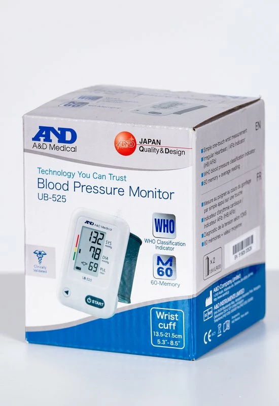 A&D Polsbloeddrukmeter Ub 525 heeft een compact design en is eenvoudig te bedienen. De polsbloeddrukmeter meet de hartfrequentie, de boven- en de onderdruk. Met de A&D Polsbloeddrukmeter Ub 525 kunt u zestig metingen in het geheugen opslaan. De meting die u als laatste heeft uitgevoerd wordt automatisch in het geheugen opgeslagen.
