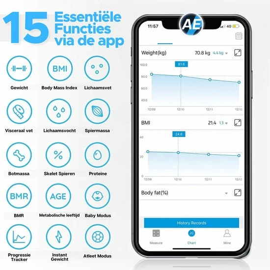 Maak gebruik van toonaangevende BIA-technologie voor nauwkeurige gegevens over de lichaamssamenstelling, waaronder Gewicht, Body Mass Index (BMI), Vetpercentage, Visceraal Vet, Water Percentage, Spiermassa, Botmassa, Skeletspier Percentage, Prote?ne Percentage, BMR & Metabolische leeftijd.