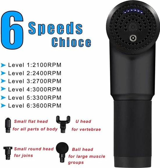 6 Stage Design + 4 massagekoppen. Snelheid 2100-3600 rpm/ min: 6 verschillende massage-intensiteiten, 4 massagekoppen voor verschillende lichaamsdelen,. U kunt de intensiteit aanpassen aan verschillende delen van het lichaam en verschillende toepassingen en massage wijzigen. Of het nu gaat om het ontspannen van spieren na het sporten of dagelijkse lichaamsmassage, het is zeer geschikt.