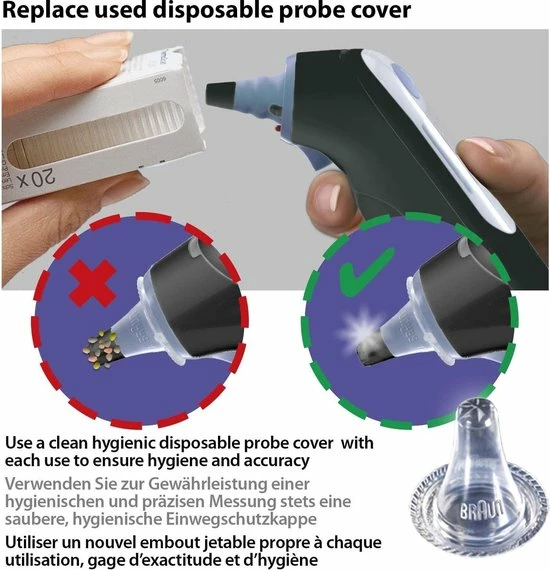 - Zeer nauwkeurig deze thermometerdoppen beschermen de trommelthermometer tegen krassen en andere onzuiverheden, wat de temperatuurmetingen kunnen be?nvloeden. Thermoscan covers kunnen worden gebruikt als vervanging voor Braun en andere Thermoscan Thermometers, waaronder: ExactempThermoscan 7 IRT 6520, IRT6020, IRT6500, Braun Thermoscan 3 IRT303 0, IRT3 020, IRT4020, IRT4520 enzovoort.