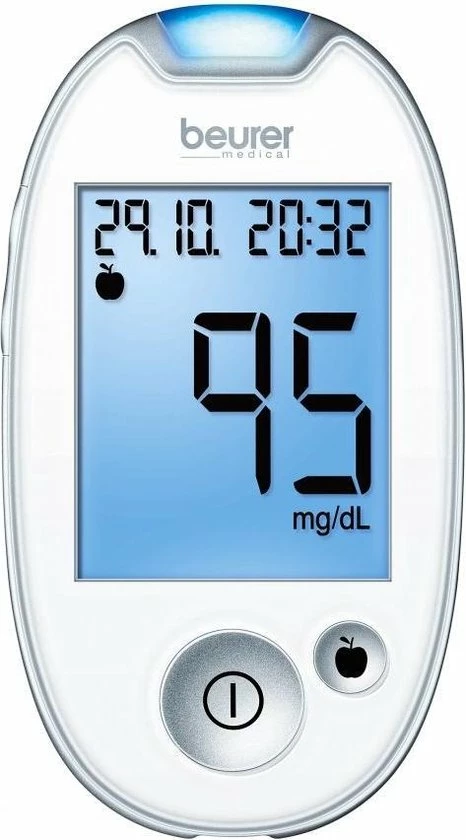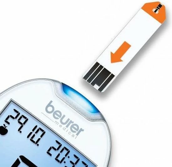 Gebruiksvriendelijk: verlichte invoersleuf, grote display met achtergrondverlichting, brede teststrips, eenvoudige meetwaardenmarkering voor optioneel diabetesmanagement: voor het eten, na het eten, algemene markering