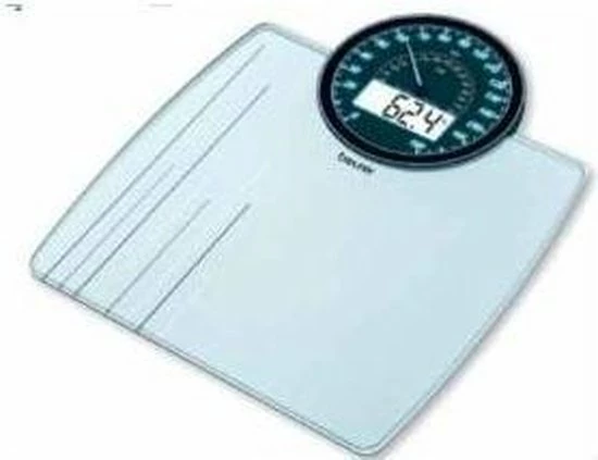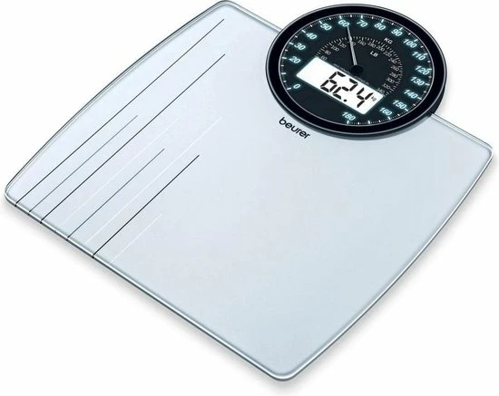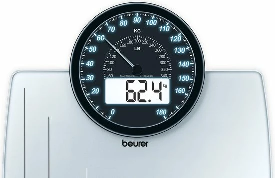 De Beurer GS58 weegschaal heeft een dubbel display. De meetgegevens worden zowel analoog als digitaal weergegeven. De weegschaal heeft ook een groot weegoppervlakte van 34×31,5 cm, en is geschikt voor maximaal 180 Kg lichaamsgewicht. De snelstartfunctie maakt hem eenvoudig in gebruik, na afloop schakelt de weegschaal automatisch weer uit. Het weegoppervlakte is gemaakt van veiligheidsglas. Kenmerken van de Beurer GS58:- Weegschaal met glazen draagplateau- Grote glazen weegschaal met cockpitontwerp- Analoog en digitaal tweevoudig display- Groot sta oppervlak van veiligheidsglas (34×31,5 cm) – LCD-display verlichting – Cijfergrootte van 26 mm – Herinneringsfunctie (alarm na 24 uur) voor vergelijkbare weegresultaten. – Draagkracht van 180 kg – 100 g gradering – Snelstart technologie – Functie voor automatisch uitschakelen – Wisselen tussen weergave van kg/lb – Incl batterijen – Afmetingen: 34×40 cm- Garantie: 5 jaar