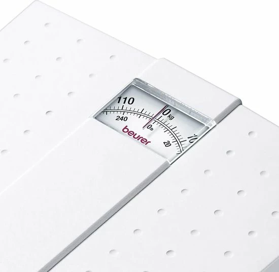 De Beurer MS01 is een mechanische weegschaal. Geen gedoe met batterijen, deze weegschaal werkt altijd. Maximaal weegvermogen van 120 kg en antislip bovenzijde. Hierdoor kan je hem veilig in de badkamer gebruiken zonder je druk te maken over eventueel glijgevaar.Kenmerken van de Beurer MS01:- Basismodel voor elke badkamer- Analoge display in kg/lb- Anti slip- Max 120kg, weegt per 100 gram – Weegoppervlak 30x26cm – Display cijfers 5mm; display 73x50mm – Grootte 30x26x5,3cm
