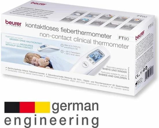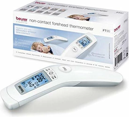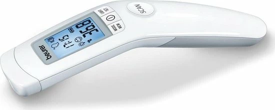 Moderne infrarood thermometer om de lichaamstempratuur via het voorhoofd te meten. Het apparaat geeft een hygienische meting zonder huidcontact. Er klinkt een signaal wanneer de meting voltooid is. Het apparaat is uitgerust met een goed afleesbaar LCD-Display. Hij meet in ?Celsius en ?Fahrenheit. Het apparaat word automatisch na 1 minuut uitgeschakeld om energie te besparen.