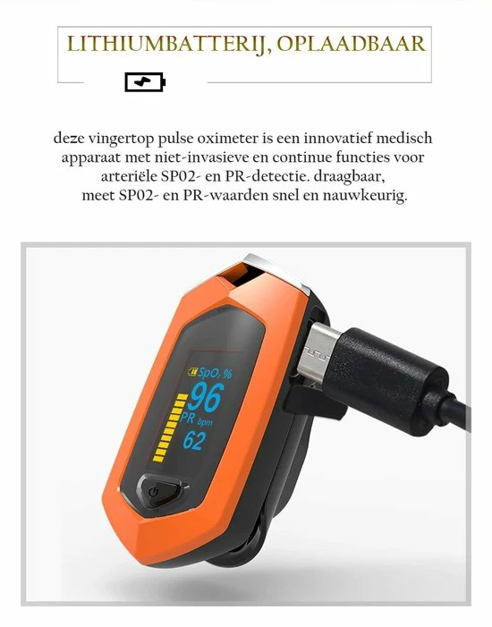 Deze professionele pulsoximeter bevat een systeem dat SP02, hartslagintensiteit en hartslaggolfvorm kan meten. Deze resultaten kunnen u een beter inzicht geven in uw werkelijke gezondheid. Uiteraard is dit een nauwkeurige momentopname.