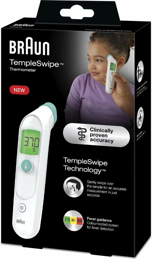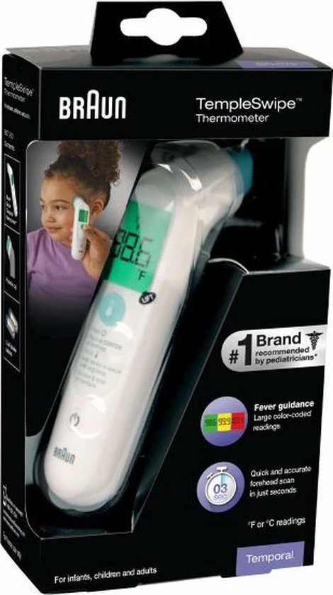 De Braun TempleSwipe™-thermometer biedt zowel gemak als professionele nauwkeurigheid. Het is snel, zacht en gemakkelijk te gebruiken – veeg eenvoudig over het voorhoofd om binnen enkele seconden nauwkeurige metingen te krijgen. Het heeft een groot, gemakkelijk af te lezen scherm met temperatuurbegeleiding dat groen weergeeft als een normale temperatuur wordt gedetecteerd, geel als er koorts wordt gedetecteerd en rood als er hoge koorts wordt gedetecteerd. De BST200 is veilig te gebruiken voor alle gezinsleden.
