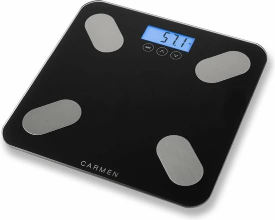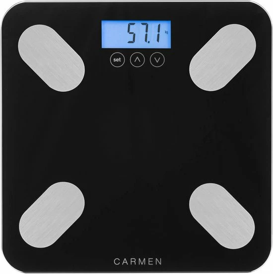 De Carmen CBS0301B personenweegschaal meet meer dan alleen jouw lichaamsgewicht. Naast jouw lichaamsgewicht meet de CBS0301B ook jouw vetmassa, hydratatie en spier- en botmassa. Deze personenweegschaal is voorzien van de nieuwste weegtechniek. Hij weegt namelijk op 4 weegpunten waardoor het gewicht heel precies gemeten wordt, namelijk op de 100 gram nauwkeurig met een maximum van 180 kg. Wat deze personenweegschaal uniek maakt, is dat hij een geheugen heeft waarbij hij de gegevens van 10 gebruikers kan “onthouden”. Heb je een streefgewicht? Deze personenweegschaal onthoudt wat je de vorige keer woog.