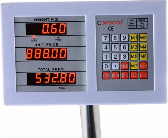 De Cenocco CC-8004 is een platformweegschaal voor de detailhandel. Het is een zeer nauwkeurige meetapparatuur die het meest geschikt is voor supermarkten, supermarkten en andere winkels. Deze weegschaal is gemaakt met behulp van zeer nauwkeurige en nauwkeurige sensoren. Het is met de capaciteit om tot 8 eenheidsprijzen en 99 accumulatie-geheugens op te slaan. Het is een veelzijdige machine omdat hij bij gebrek aan netstroom ook op een oplaadbare batterij werkt. De weegschaal wordt ook automatisch uitgeschakeld wanneer deze niet wordt gebruikt. Om energie te besparen.