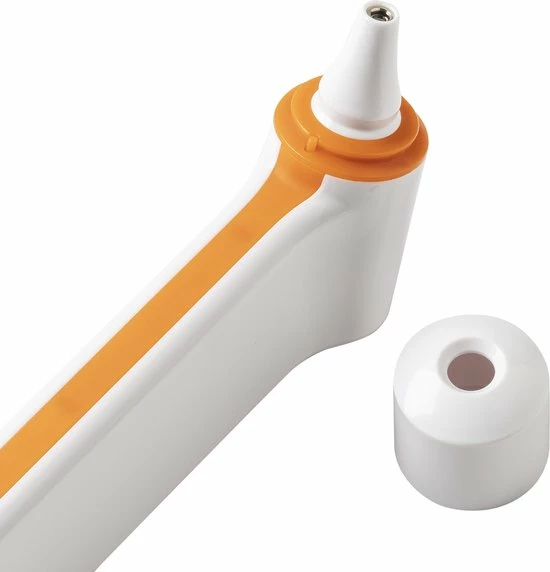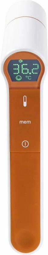 De ideale digitale infrarood lichaamsthermometer met alarmfunctie en een groot -, makkelijk afleesbaar -, kleuren display dat de status van uw lichaamstemperatuur als een stoplicht in groen, oranje, rood aangeeft. Zeer eenvoudige éénknopsbediening en meetresultaat binnen 1 seconde. Door de afneembare afdekkap kan deze thermometer ook zonder beschermhoesjes als oor thermometer worden gebruikt. Zeer geschikt voor gebruik bij baby’s en jonge kinderen. Met koortsalarm en geheugen voor 9 metingen. De temperatuur eenheid is instelbaar in Celsius en Fahrenheit. Ook te gebruiken voor de temperatuurmeting van een oppervlak, denk bijvoorbeeld aan de temperatuurmeting van babymelk