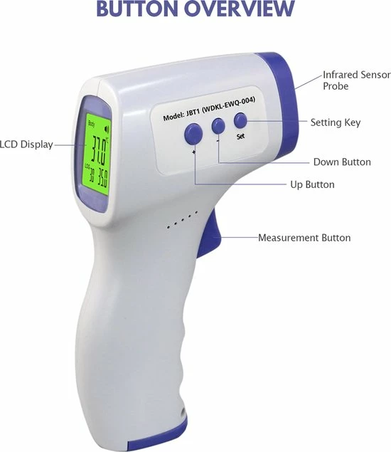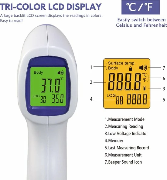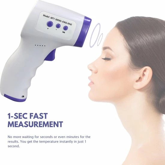 Houdt de thermometer op maximaal 40 cm afstand en richt op het voorhoofd. Binnen 1 seconden wordt de temperatuur zeer nauwkeurig weergegeven op het display. Hiermee weet detecteer je koorts direct en kan adequaat gehandeld worden.