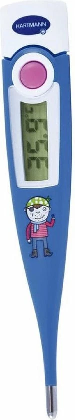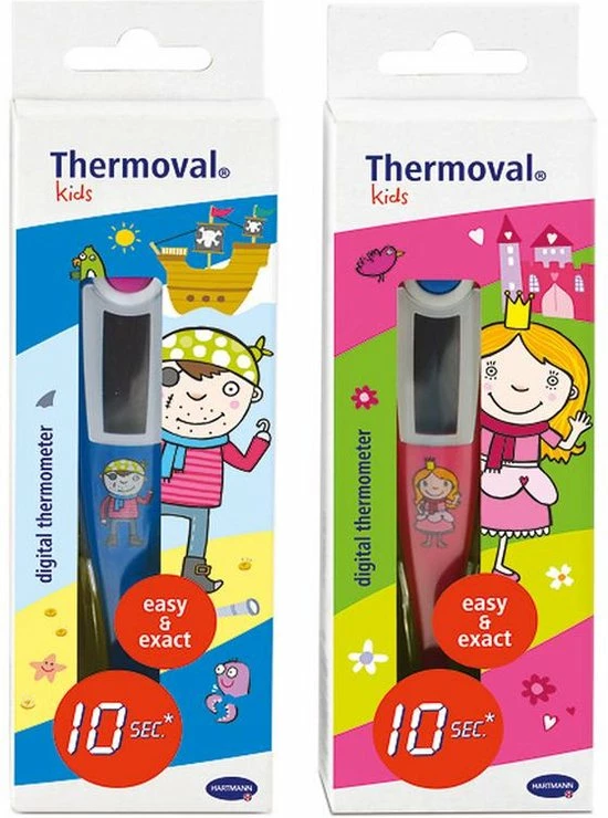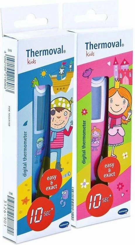 De Thermoval? Kids digitale koortsthermometer heeft een bijzonder korte meettijd van circa 10 seconden en is voorzien van een vrolijke applicatie, speciaal voor kinderen en verkrijgbaar in 2 uitvoeringen (blauw en roze). De thermometer is uitgerust met een harde meetpunt, een extra groot LCD display, een start-/stopknop en een afneembaar batterijdeksel. Het display toont de gemeten temperatuur in ?C, de status van de batterij, er is een geluidsignaal bij gebruiksgereedheid en einde van de meettijd, een automatische start/stop functie en een geheugenfunctie met de laatst gemeten waarde. De thermometer is voorzien van een automatische uitschakelfunctie, werkt met een vervangbare long-life batterij en is waterdicht. De koortsthermometer mag daarom voor een grondige reiniging en desinfectie in vloeistof of lauwwarm water worden gedompeld. De Thermoval? Kids meet de lichaamstemperatuur binnen de volgende tijden: