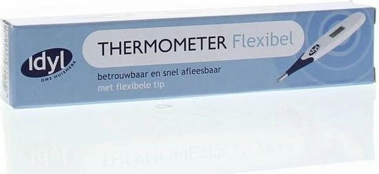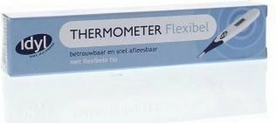 De digitale koortsthermometer van Idyl is een zogenaamde maximumthermometer. Dat wil zeggen dat de hoogst gemeten temperatuur al na 60 seconden wordt weergegeven. De laatst gemeten waarde wordt telkens opgeslagen en is af te lezen op het LCD-scherm op de thermometer. De thermometer heeft een meetbereik van 32,0 tot 43,9 graden Celcius. Bovendien heeft deze thermometer een koortsalarm en een functietest. De koortsthermometer heeft een flexibele meetpunt en wordt geleverd inclusief batterij.
