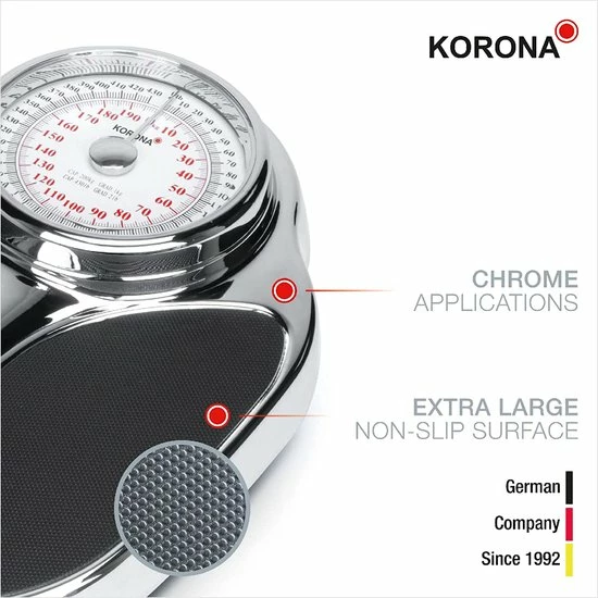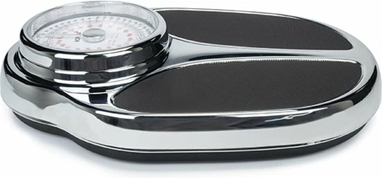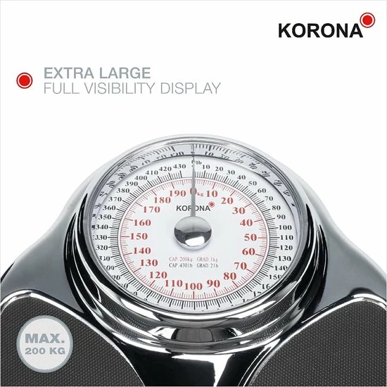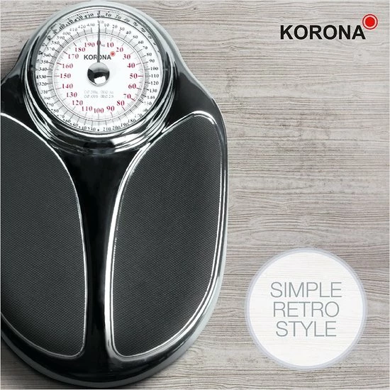 De Korona Theo Analoge Personenweegschaal is een trendy retro analoge weegschaal met luxe chromen afwerking. met een draagkracht van 200 kg geeft deze weegschaal het gewicht in stappen van 1 kg aan. Het extra grote weegoppervlak met een antislip rubberen mat zorgt voor een veilige stand.