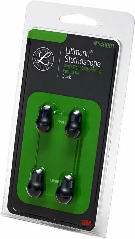 Kit met reserveonderdelen voor alle Littmann-stethoscopen, bevat twee kleine (1/2 inch), zwarte, klikvaste oordopjes. Klikvaste oordopjes met zachte afdichting voelen comfortabel aan in het oor en bieden een uitstekende akoestische dichting. De oordopjes klikken stevig vast aan de uiteinden van de oorbuisjes en zijn, voor de veiligheid, niet zomaar te verwijderen.