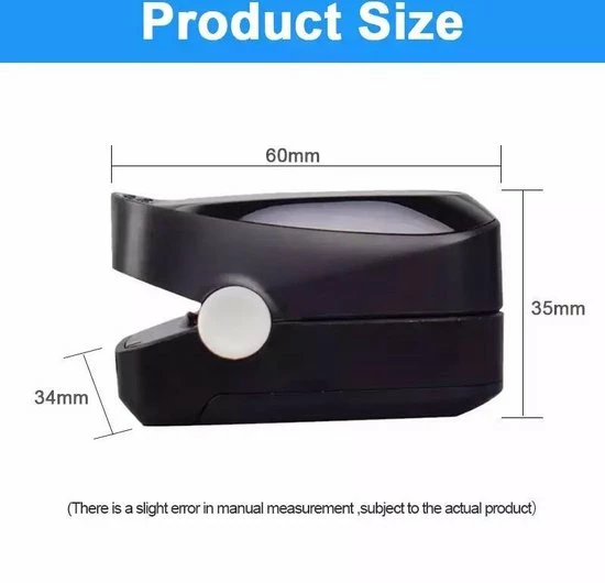 Voeding: 2X AAA batterijen (niet meegeleverd) – Afmetingen: 60x35x35mm – Kleur: Zwart – OLED Display – SpO2 Meetbereik: 70% – 99%± 2% accuraat – Pulse Rate: 30BPM – 240BPM± 1BPM accuraat – Binnen enkele seconde resultaat – FDA en TÜV gecertificeerd – Meegeleverd keycord