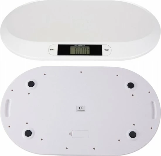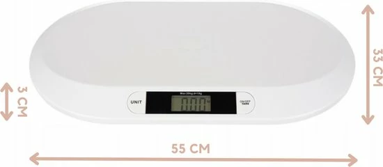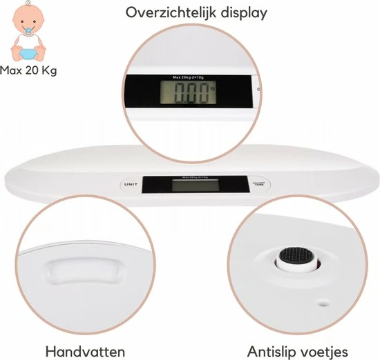 Met deze digitale baby weegschaal kun je de gewichtstoename van je baby eenvoudig volgen. De babyweegschaal wordt gekenmerkt door zeer nauwkeurige metingen, die worden weergegeven op een duidelijk en gemakkelijk af te lezen display. Hij heeft een TARA-functie en een geheugen voor de laatste meting, waardoor je comfortabel de gewichtsverandering van de baby kunt registreren.