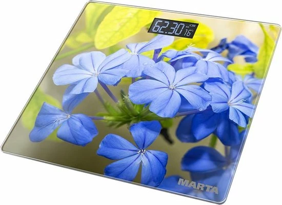 Het wegen van uw gewicht was nog nooit zo leuk als met deze fraai vormgegeven glazen weegschaal van MARTA. Leuk detail is de omgevingstemperatuur indicatie in het display. Met zijn duurzaam gepolijste gehard glazen weegoppervlakte met afgeronde hoeken, een groot display en zijn vrolijke look mag deze weegschaal best gezien worden en hoeft u hem niet onder het bed te verstoppen!