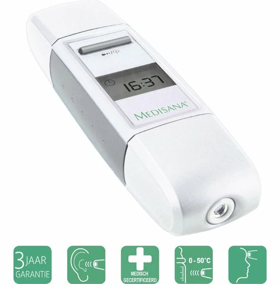 De FTD infraroodthermometer van Medisana meet zeer snel, is gebruiksvriendelijk en uiterst precies. Binnen enkele seconden geeft deze thermometer het resultaat al weer. De lichaamstemperatuur kan op twee manieren gemeten worden: op het voorhoofd of in het oor. Voor deze laatste methode verwijdert u het kapje aan de voorzijde. De oorsensor zelf is waterdicht en kan gedesinfecteerd worden met een alcoholoplossing, waardoor geen aparte kapjes nodig zijn.