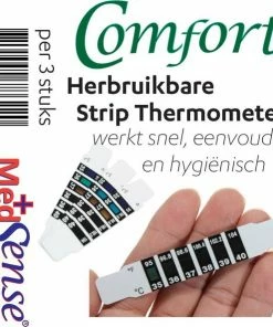 De herbruikbare stripthermometer van MedSense? geeft een temperatuurmeting in Celcius en Fahrenheit.