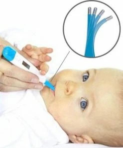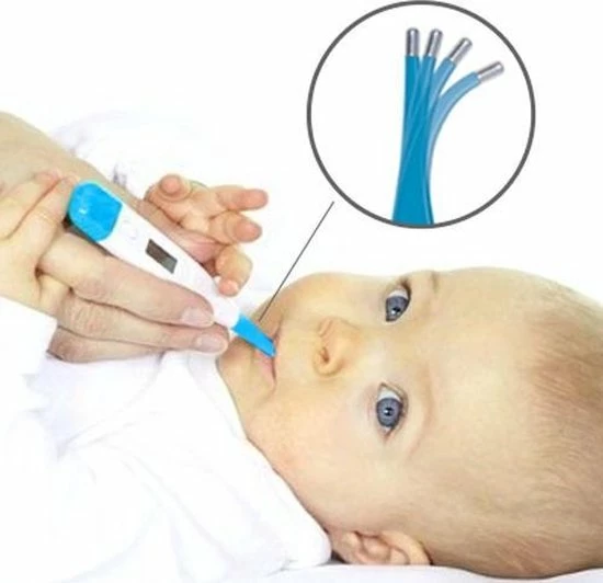Deze digitale thermometer is speciaal geschikt voor baby?s. Dankzij de flexibele punt buigt de thermometer mee met de bewegingen van uw baby voor comfort en het vorkomen van verstikkingsgevaar. Ook als uw kind zijn hoofd beweegt. Bij koorts zal de thermometer intensief piepen zodat het meteen duidelijk is of uw kind last heeft van verhoging. De thermometer is geschikt voor het meten van de temperatuur via de oksel, de mond of het rectum. De meter werkt op batterijen.