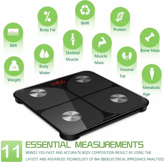 Traditionele weegschalen meten alleen eenvoudige gewichten, maar deze Body Fat Weight Scale maakt gebruik van Bio-elektrische Impedantie Analyse (BIA) technologie, die nauwkeurig 11 lichaamsstatistieken kan meten, waaronder lichaamsvetpercentage, watergewicht, spierpercentage, botmassa en spiermassa. Stap op de weegschaal met blote voeten, elektroden die onder elke voet zijn geplaatst, zenden een onschadelijke, lage elektrische stroom door uw lichaam. Het signaal gaat snel door vetvrije massa, terwijl vet de stroom vertraagt, waardoor het kan inschatten hoeveel van uw lichaam vet is en welk deel vetvrije massa is. Dit signaal is volkomen veilig en zal niet worden gevoeld. Deze Smart Badkamerweegschaal biedt u een echte indicator van uw innerlijke gezondheid en kan na verloop van tijd het effect van elk fitnessprogramma of afslankprogramma laten zien.