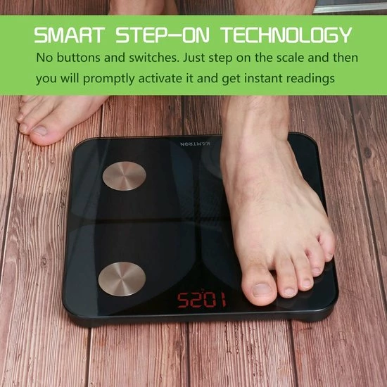 - Step-on-technologie – Geen knoppen en schakelaars Stap gewoon op de slimme weegschaal om tijdige metingen te krijgen Zodra het apparaat opnieuw is aangesloten, worden de gegevens gesynchroniseerd.