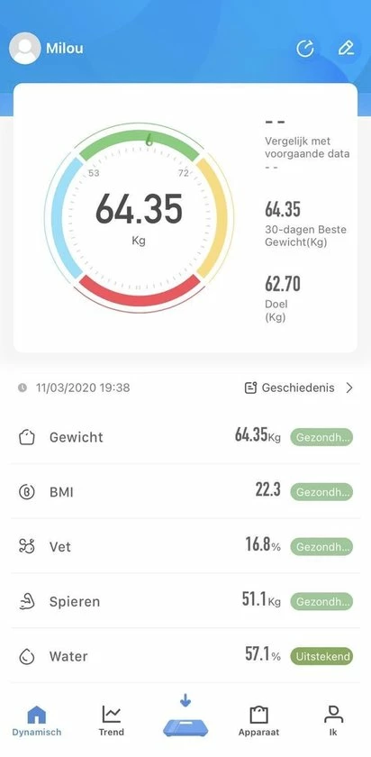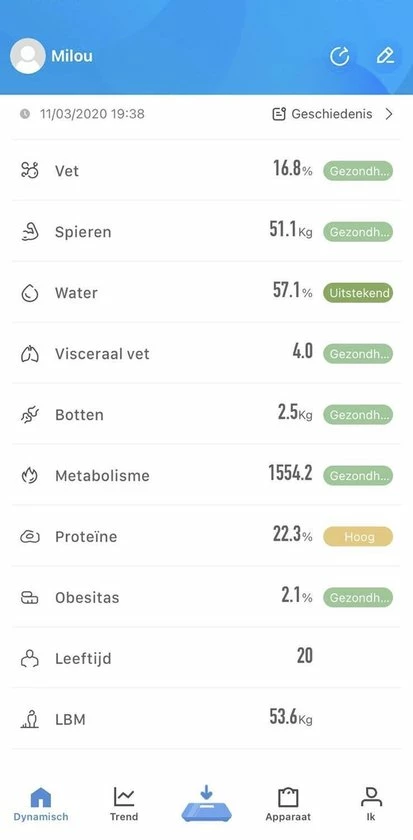 De weegschaal vertelt niet alleen je gewicht maar geeft ook een lichaamsanalyse door middel van een app. Met 12 indicatoren worden naast gewicht ook andere resultaten weer gegeven zo kun je ook je voortgang op he gebied van sport- en lichaamsactiviteit meten en wordt niet alleen je gewicht weergegeven.