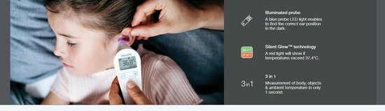 – zeer snelle en precieze meting van de temperatuur met infrarood – latex- en BPA-vrije beschermkapjes voor een hygi?nische en veilige meting – geeft de juiste positie in het oor met een “goed” op het LCD-scherm en een piepje