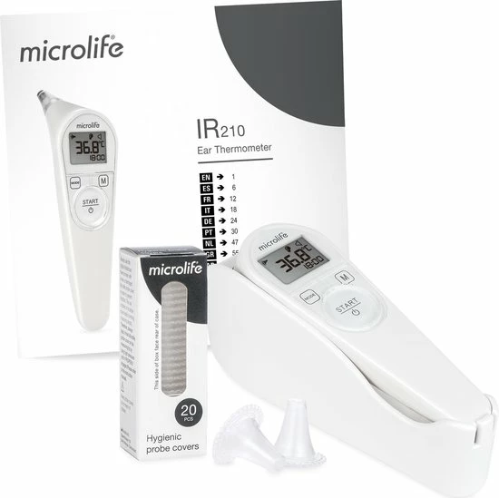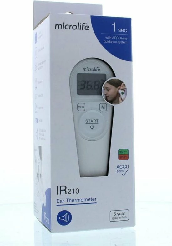 Microlife IR 210 is een nauwkeurige en betrouwbare (klinisch gevalideerd) infrarood oorthermometer. Het meten via het gehoorkanaal zorgt voor een betrouwbare, snelle en pijnloze temperatuurmeting. Het meetbereik ligt tussen de 0 – 100?C, meet eenheid: 0.1 ?C. De meetnauwkeurigheid tussen de 35.0 – 42.0 ?C is ?0.2 ?C.