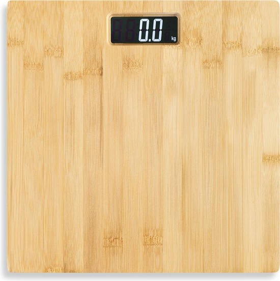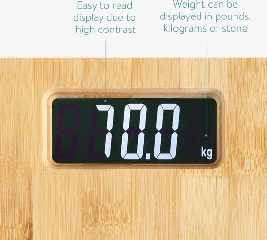 - AANTREKKELIJK DISPLAY: Het zwarte scherm met witte cijfers toont duidelijk je gewicht. Het grote, contrastrijke display is een opvallend kenmerk van onze bamboe weegschaal.