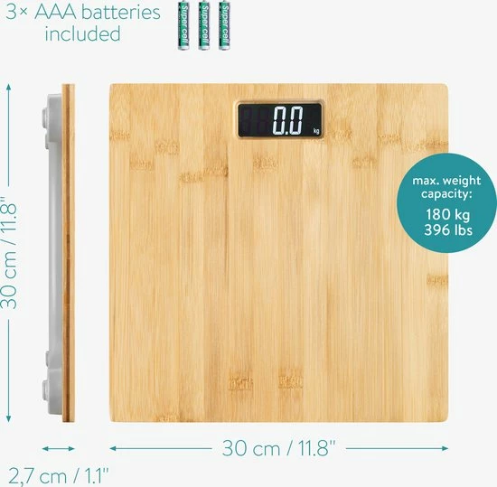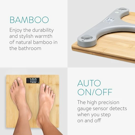 - Het platform van de weegschaal is 30 cm in het vierkant en is gemaakt van natuurlijk bamboemateriaal om elke kamer een warme toon te geven. Het bamboe is afgewerkt met een speciale laag voor bescherming tegen vocht in de badkamer.