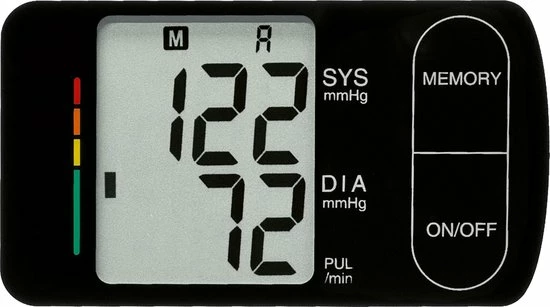 - Volautomatische bloeddruk- en hartslagmeting, nauwkeurig en snel bij de pols Eenvoudig in gebruik Groot, goed afleesbaar LCD-scherm Instelling van de meetwaarden conform beoordelingssysteem van de WHO (World Health Organisation) 3-waardenweergave (bovendruk, onderdruk, hartslag) Aritmiedetectie (onregelmatige hartslag) 2 x 60 geheugenplaatsen, geschikt voor maximaal 2 personen Berekening van de gemiddelde waarde van de laatste 3 meetwaarden, ideaal ter controle van een langdurige meting Weergave van datum en tijd Duurzame klittenbandsluiting Automatische signaaltoon aan het begin en einde van een meting Automatisch uitschakelen (na 1 min. zonder te zijn gebruikt), voor een langere levensduur van de batterij Indicatie voor het vervangen van de batterij Medisch product Werkt op batterijen: 2x AA batterij (penlite, niet meegeleverd) Gecertificeerd conform EN1060/MDD/CE 0197