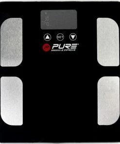 Pure2Improve lichaamsvet slimme weegschaal in zwart met P2I logo, 8mm gehard glas, max cap 200kg. LCD grootte 82x44mm. Kenmerken: lichaam vet, water, spier divisie, botmassa, bmi, bmr, viscerale rating. geheugen voor 8 Personen. Automatisch in-/ uitschakelen. Divisie: 0.1kg/0.2lb. Vermogen: 4 x 1.5V aaa-batterijen meegeleverd. Verpakt in doos.