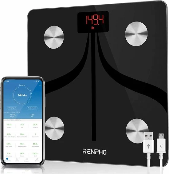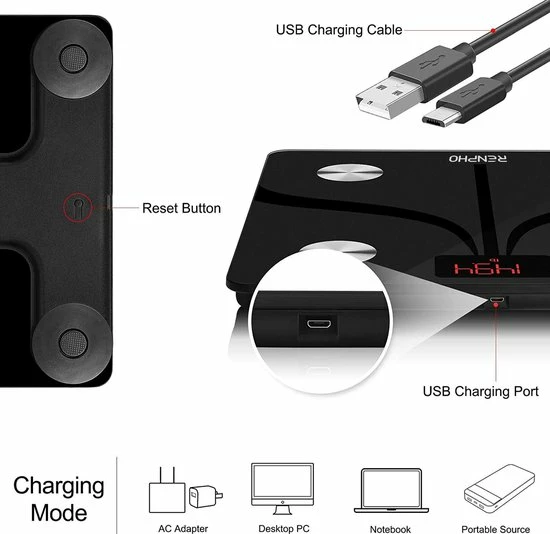 - USB oplaadbaar en werkt langdurig : Renpho lichaamsvetweegschaal is USB oplaadbaar met een ingebouwde lithiumbatterij, genoeg voor 2-3 maanden gebruik na volledig opgeladen.