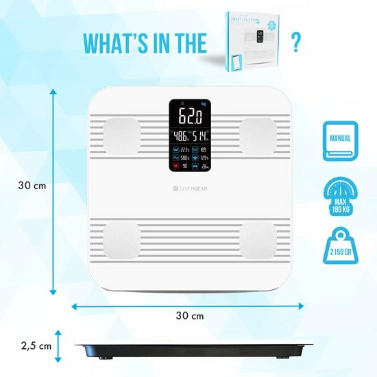 Heb jij behoefte om meer van je lichaam te weten te komen dan alleen hetgeen je zelf voelt of ziet? Deze weegschaal biedt jou een totaalplaatje van je fysieke gesteldheid. Dankzij vier ultragevoelige sensoren worden maar liefst 17 gezondheidswaarden gemeten waarmee jij je gezondheid in kaart kunt brengen. De slimme meettechnologie meet bijvoorbeeld je vetpercentage, je vetvrije gewicht, je spiermassa, botmassa en het prote?negehalte in je lijf. Ook kun je je BMI aflezen, geeft de weegschaal je een indicatie van je lichaamsleeftijd ?n kun je je hartslag meten. Hieronder lees je alle meetfuncties van de Smart Scale Pro.