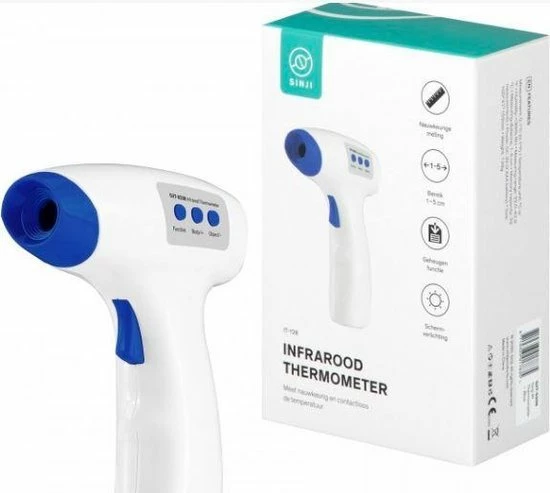 Snel en hygi?nisch je temperatuur opmeten? Dat doe je met deze professionele Infrarood thermometer.Deze thermometer voldoet aan alle eisen, volgens de medisch CE norm. Op een veilige afstand van 1 tot 5 centimeter meet deze handige infrarood thermometer binnen 1 seconde accuraat je temperatuur op. De beste meting met deze contactloze thermometer gaat simpel en hygi?nisch via je voorhoofd! Contactloze thermometers zijn eigenlijk onmisbaar in ieder huishouden, want jouw gezondheid staat voorop. Knipper met je ogen en je weet nauwkeurig je lichaamstemperatuur! Het geheugen van deze koortsthermometer biedt plaats voor 32 metingen, zodat je ontwikkelingen in de temperatuur bij ziekte op de voet kunt volgen.