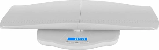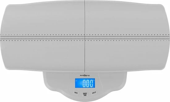 Naast de hoge capaciteit overtuigt de babyweegschaal ook met een nauwkeurigheid van 100 g per 5 kg. De resultaten worden snel weergegeven binnen 2 s op de 69 x 33 mm LCD. Functies zoals Hold, Tare en wisselende eenheden tussen kg, oz en lb kunnen gemakkelijk worden opgeroepen met behulp van de drie grote toetsen, waardoor de witte plastic schaal bijzonder veelzijdig.De babyschaal kan worden gebruikt met het weegplatform van 355 x 308 mm of met de weeglade van 600 x 258 mm. De babylade heeft lasergegraveerde markeringen, zodat u de grootte van het kind bepalen op hetzelfde moment als het wegen. De hangende weegschaal wordt gevoed door drie AAA 1.5 V batterijen die meegeleverd worden. De automatische uitschakeling die na 5 minuten inactiviteit van kracht wordt, voorkomt dat de batterijen leeg raken en zorgt voor een lange gebruiksduur.