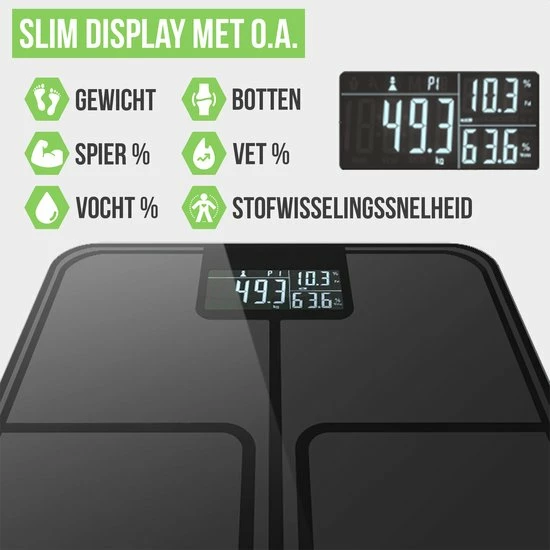 Onze weegschaal toont je lichaamsgewicht, lichaamstype, spiermassa, bot massa, vet percentage, BMI, vochtgehalte, onderhuid vet, eiwit verhouding, visceraal vet, metabole leeftijd, BMR, standaard gewicht, gewicht indicatie, vooruitgang, obesitas niveau, eiwitten en skelet spieren; en dat allemaal in 1 apparaat.