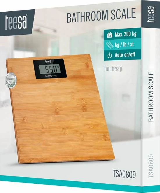 Wilt u uw gewicht onder controle houden? En bent u op zoek naar een goede weegschaal om dit bij te houden? Dan is de TSA0809 van Teesa de perfecte keuze. Deze digitale personenweegschaal met LCD-display vermeldt uw gewicht uiterst nauwkeurig, in drie eenheden. Een bijzonder kenmerk van deze TSA0809 weegschaal is bovendien het design. Het bamboe plateau zorgt niet alleen voor een stijlvolle uitstraling in de badkamer, maar is ook nog eens zeer duurzaam en gemakkelijk schoon te maken. Naar uw eigen gewicht kijken is nog nooit zo leuk geweest dankzij deze Teesa weegschaal!