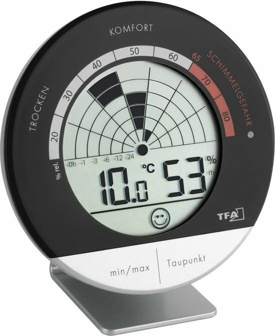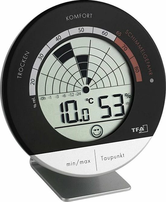 Deze lastige medebewoners krijgen geen kans als de schimmelradar in gebruik is. Want alleen een blijvend hoge luchtvochtigheid van meer dan 65 % kan de gevreesde schimmels op wanden en in kasten veroorzaken. De innovatieve grafische mogelijkheden van de thermo-hygrometer geeft de gemeten luchtvochtigheidwaarde van de laatste 24 uur zeer overzichtelijk weer zoals op een radarscherm. Dreigend schimmelgevaar kan zo in een oogopslag worden gedetecteerd. Bovendien waarschuwt een optisch en akoestisch signaal. De digitale schimmelradar thermo-hygrometer is een ideaal meetinstrument voor de controle van het klimaat in een ruimte. Naast de kamertemperatuur en de luchtvochtigheid met de max. – en min.waarden, wordt het dauwpunt weergegeven, dus de temperatuur waarop de lucht begint te condenseren en koudere plaatsen waterdruppels gevormd worden, de voorgangers van schimmel. U kunt deze waarden op de schimmelradar eenvoudig in het oog te houden en door gericht verwarmen en ventileren maatregelen treffen. Zo schept u een behaaglijk en gezond woonklimaat en bespaart zelfs op verwarmingskosten.
