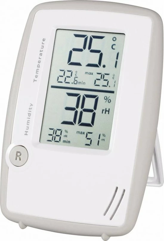 Dit kleine, handige apparaat toont alle gemeten parameters tegelijkertijd op een grote display. Het is voorzien van een opklapbare standaard voor tafel of wand en een eersteklas afwerking van de behuizing met rubber.