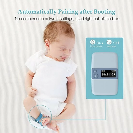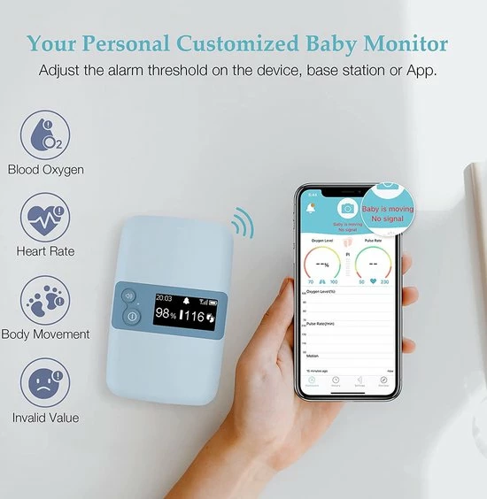 De babyfoon van medische kwaliteit met pulsoximetriesensor op een volledige lading kan tot 16 uur lang continu biometrische gegevens volgen, zoals zuurstofniveaus, hartslag en lichaamsbeweging. Alle nauwkeurige metingen zijn in ??n oogopslag duidelijk op het hoofdapparaat, het basisstation en de smartphone.