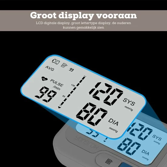 Het heeft een LCD-scherm met een groot lettertype waarop jij je metingen duidelijk kunt zien en ook bruikbaar is voor slechtzienden. Het vereenvoudigde display betekent dat je precies ziet wat je moet weten over je hartgezondheid: polsslag, systolische druk en diastolische druk.