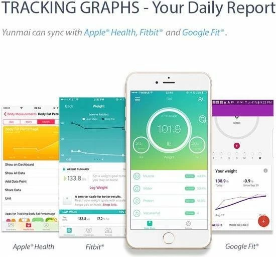 - Yunmai App kan synchroniseren met Apple Health, Fitbit, Google Fit & Samsung Health